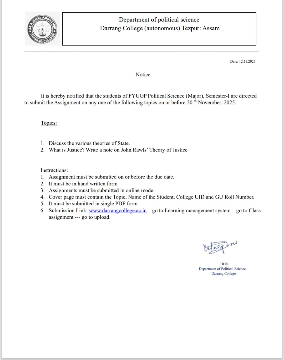 | Expired | RAINY SAIKIA | FYUGP 1ST SEM ARTS General | POLITICAL SCIENCE | Introduction to Political Theory | 2025-11-15 | Submission Date Expired |